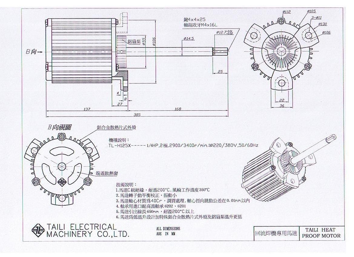 耐高温电机采用的是进口耐高温轴承6202、6201,采用耐高温绝缘材料,保证马达在高温环境下安全运行,不老化,不烧坏。马达耐温200°C,风轮工作温度350°C。马达引出线长650MM ,耐高温200°C以上。马达采用特殊铝合金外观设计,散热片式外壳及铝扇造型美观,温升更低。采用先进的热力学分析方法结构设计。