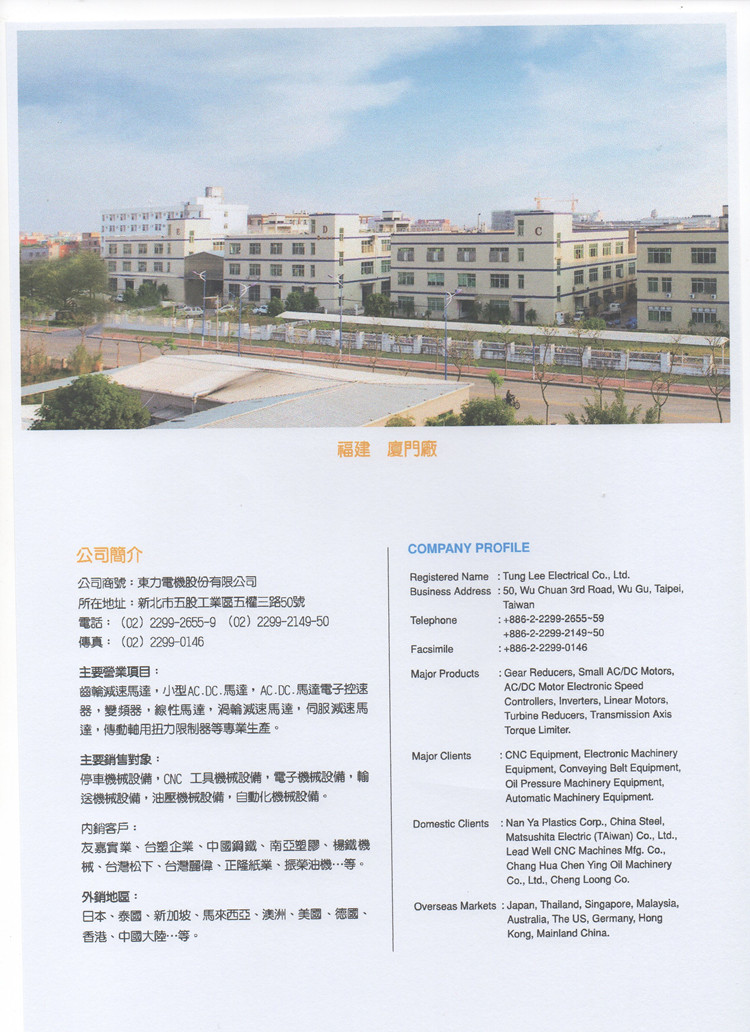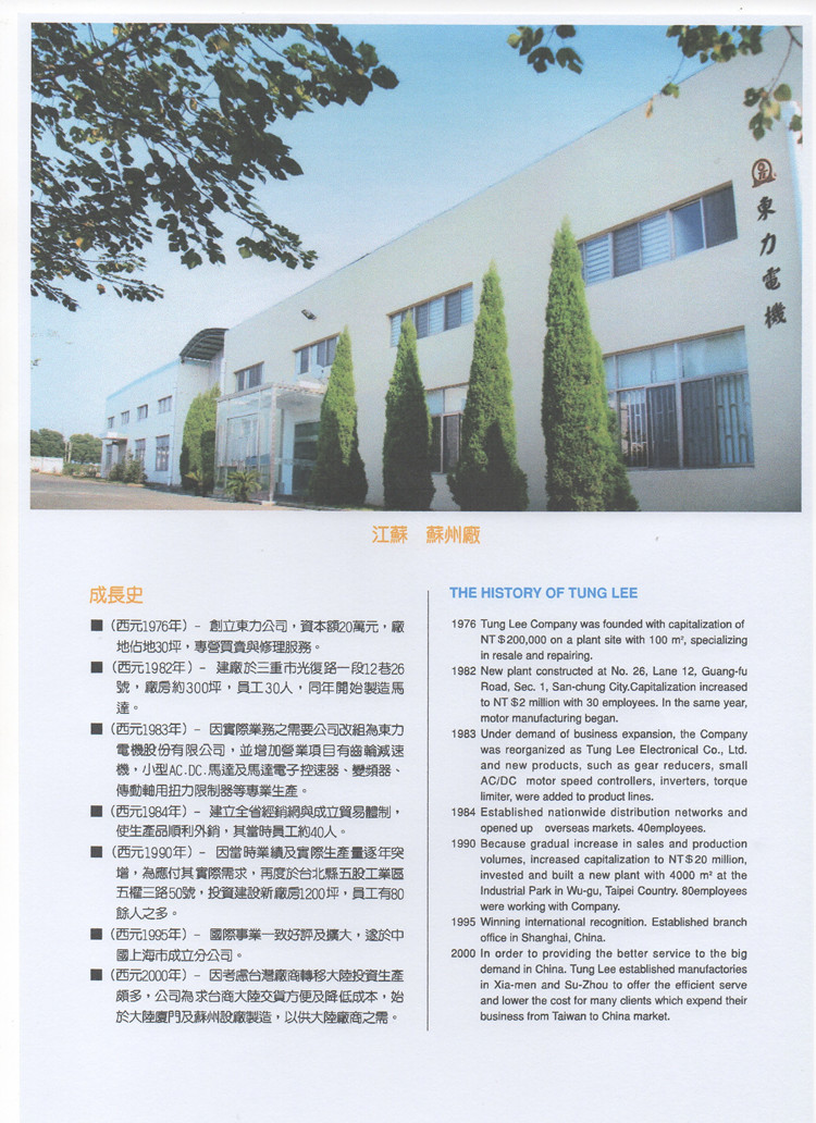 之后因台湾东力电机股份有限公司生产的减速马达质量稳定品质过硬,收货众多机械设备制造厂的认可和青睐业务接二连三增长,于2002年在美丽的厦门创建了第二个组装工厂即东历(厦门)电机有限公司并在国内统一注册为“TUNGLEE东历电机”。