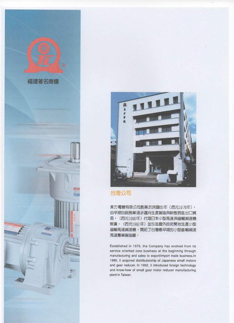台湾东力电机股份有限公司是中国一家著名电机减速机生产厂商,创始于1976年自今已40年了,专门负责生产减速马达、齿轮减速机、。首先在1998年在广东省东莞市创建了第一家东历电机组装工厂将台湾的减速机、马达、减速电机、控制器等配件货柜运输到广东依照客户选定的减速比功率开展组装生产,大幅缩减了台湾东力减速马达的交期提升了供货效率和售后效率。