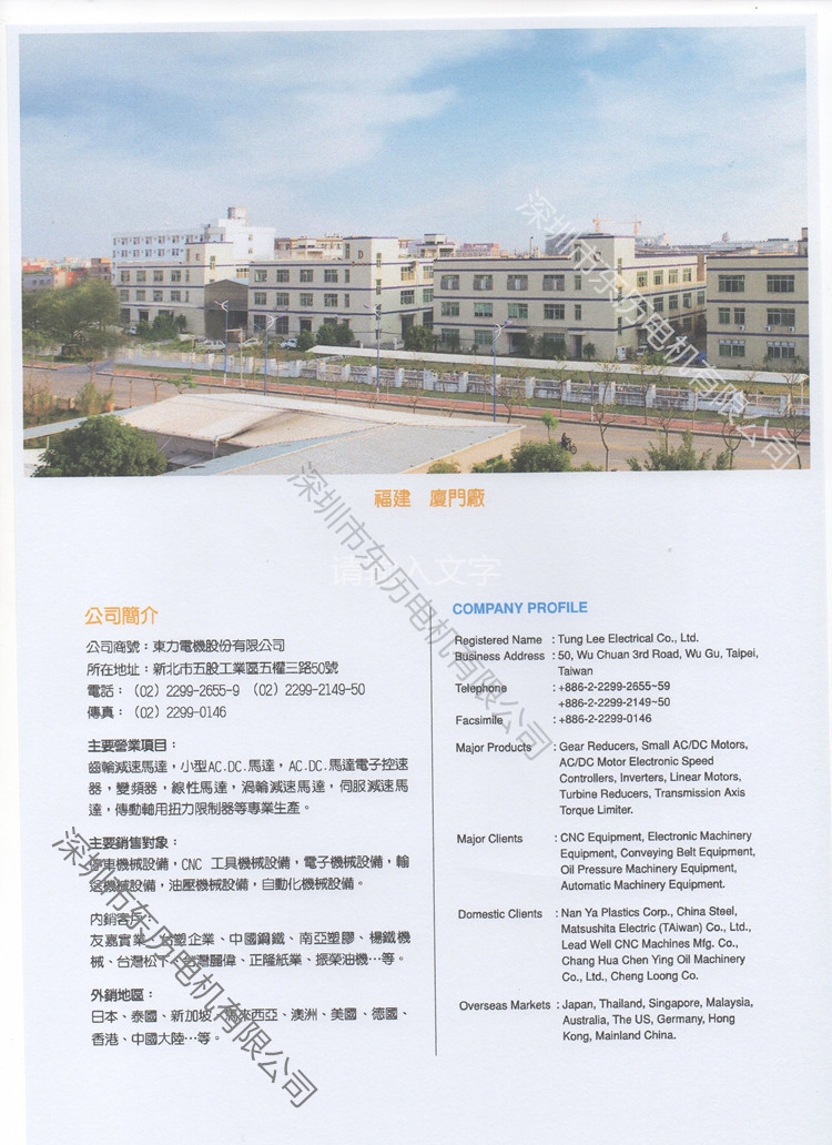 深圳市东历电机有限是台湾东力电机股份有限公司的深圳营业处专业负责台湾东力电机、东历(厦门)电机的经销和售后并代理TWT东炜庭马达、厦门东炜庭电机、台湾东炜庭电机、台湾北译电机、北译马达、万鑫减速机、城邦减速机、台湾河见水泵、沃森变频器欢迎广大新老客户前来咨询我司会以最优惠的价格期待与您的合作。