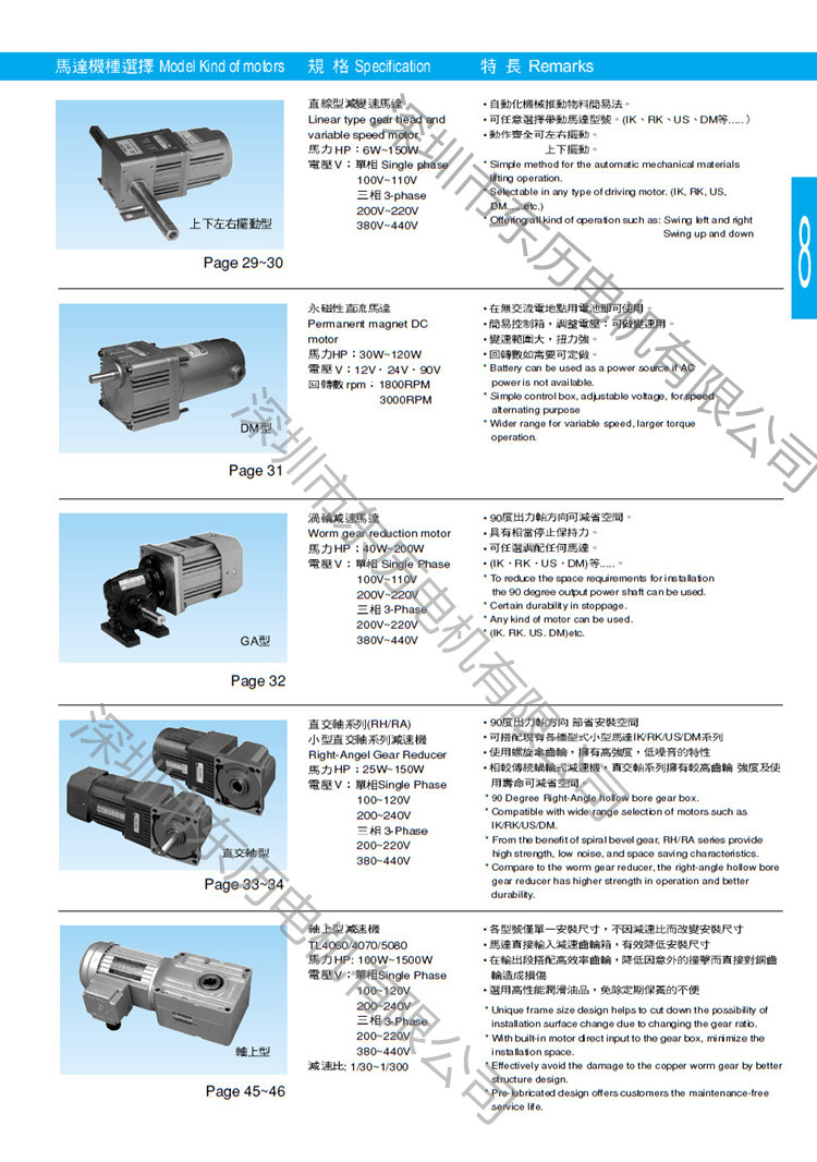 TL东力(东历)电机系列产品的主要分类:台湾东力电机、台湾东力减速机、台湾东力调速电机、台湾东力三相异步电机、台湾东力单相电容运转异步电动机、台湾东力三相刹车电机、台湾东力直线电机、台湾东力齿轮减速电机、台湾东力调速器、台湾东力伺服减速机、台湾东力齿轮减速机;TL东历(厦门)电机、TL东历(厦门)减速电机、TL东历(厦门)减速机、TL东历(厦门)卧式减速马达、TL东历(厦门)立式减速马达、TL东历(厦门)刀库电机;TL苏州东力电机、TL苏州东力减速马达、苏州东力停车场电机、苏州东力立体车库电机、TL苏州东力纺织设备专用减速马达、苏州东力减速机等机电产品。
