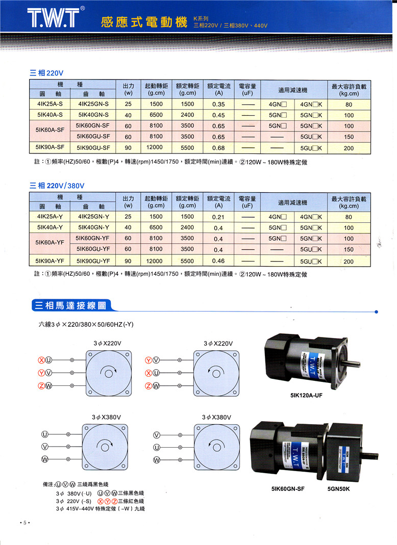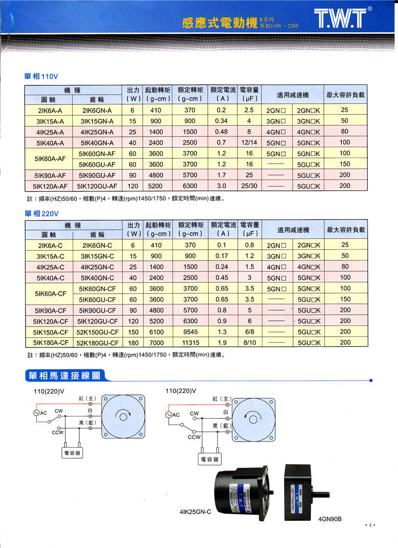 特长: 单相马达使用电容式感应马达,故高功率、低噪音。电机使用范围广泛,功率齐全;感应式电机适合于长时间的一个方向的持续运转; 反转时只有在电机彻底停止后才能进行反向的运转;不能像可逆电机一样进行比较快速的反向运行;所以,如果你的产品不需要马达在运行完一个动作后很快或瞬间进行反方向运行的话,请选感应马达。三相马达可以使用三相电源220v-380v,满足各样的需求。